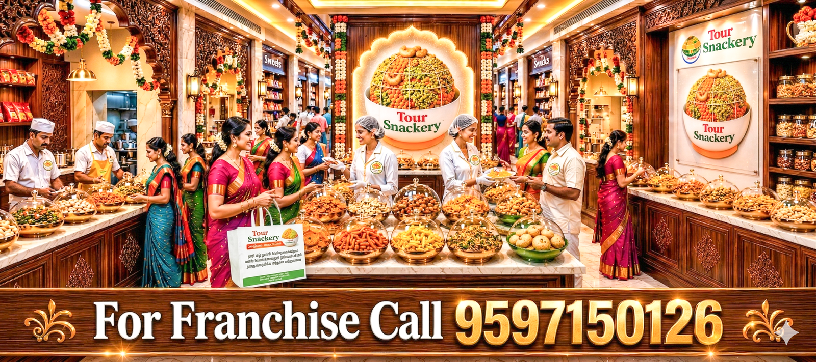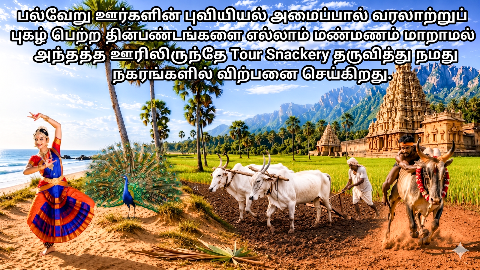 Toursnackery என்பது தமிழ்நாட்டின் பாரம்பரிய மற்றும் பிரபலமான தின்பண்டங்களை ஒரே இடத்தில் கொண்டு வந்து வழங்கும் ஒரு சிறப்பு விற்பனை தளம். எங்கள் நோக்கம். தரம், சுவை மற்றும் நம்பிக்கை – இதுவே எங்கள் அடையாளம்.
